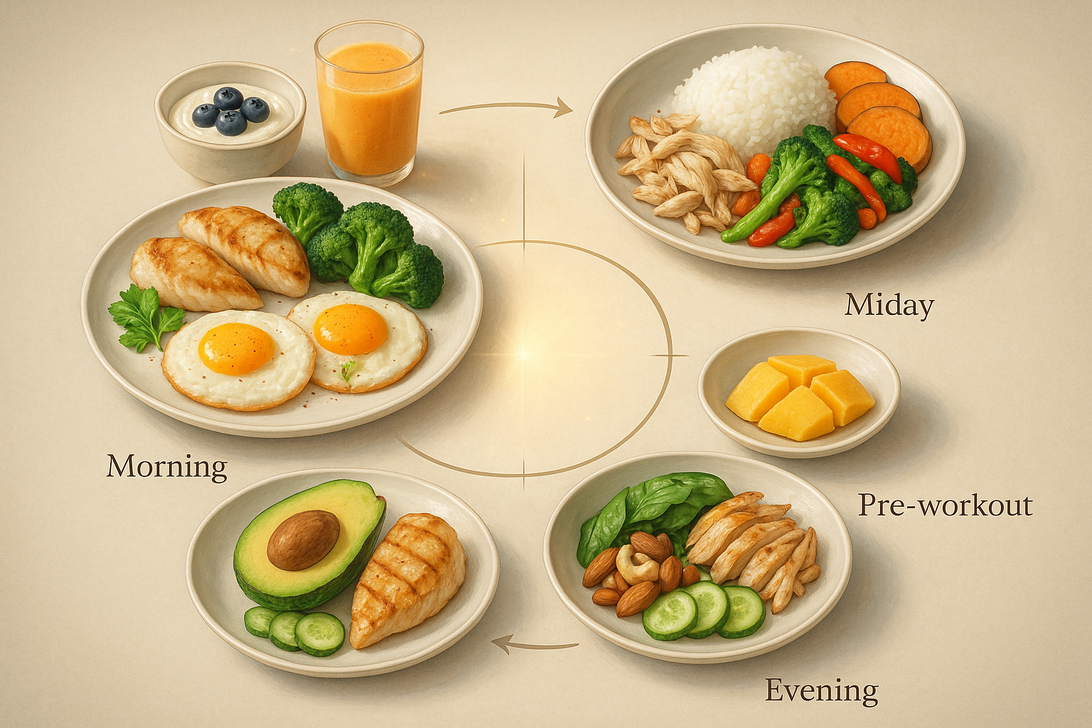 กลุ่มโปรตีน: เน้นที่มีกรดอะมิโนจำเป็น 9 ชนิด, ย่อยง่าย, มีประสิทธิภาพในการสร้างซ่อมแซมกล้ามเนื้อ เช่น ไข่, อกไก่, กรีกโยเกิร์ก, เวย์โปรตีน, ปลาแซลมอน, ปลาทูน่า, เต้าหู้, โปรตีนพืชต่างๆ